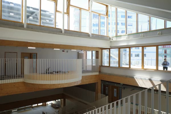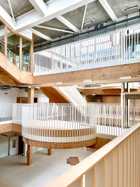 Le troisième, lié à ces terrasses, c’est la création d’espaces scolaires ouverts à une nouvelle pédagogie, avec la conception de l’aménagement intérieur. La quatrième, le culot de la mise à nu des installations y compris avec leurs bandes adhésives pour garantir les performances dans le cadre E+C-.