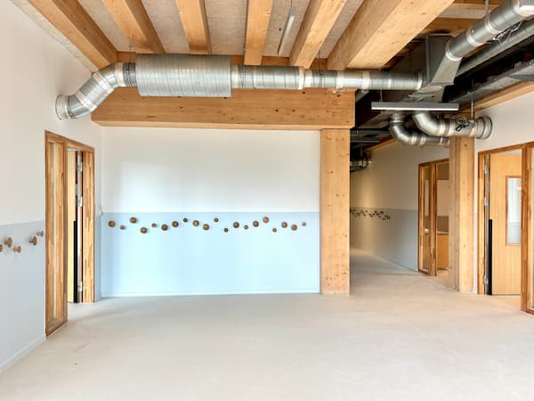 Salle de classe témoin. Dans ce cas particulier, un mur de refends en béton est laissé comme tel. Egalement apparent, l'insonorisation de la ventilation. Les solives avec absorbant Organic intercalé ne seraient plus possible en cas d'application de la doctrine imposée par les sapeurs-pompiers de la préfecture de police de Paris (mais ça passe très bien ailleurs). © Jonas Tophoven