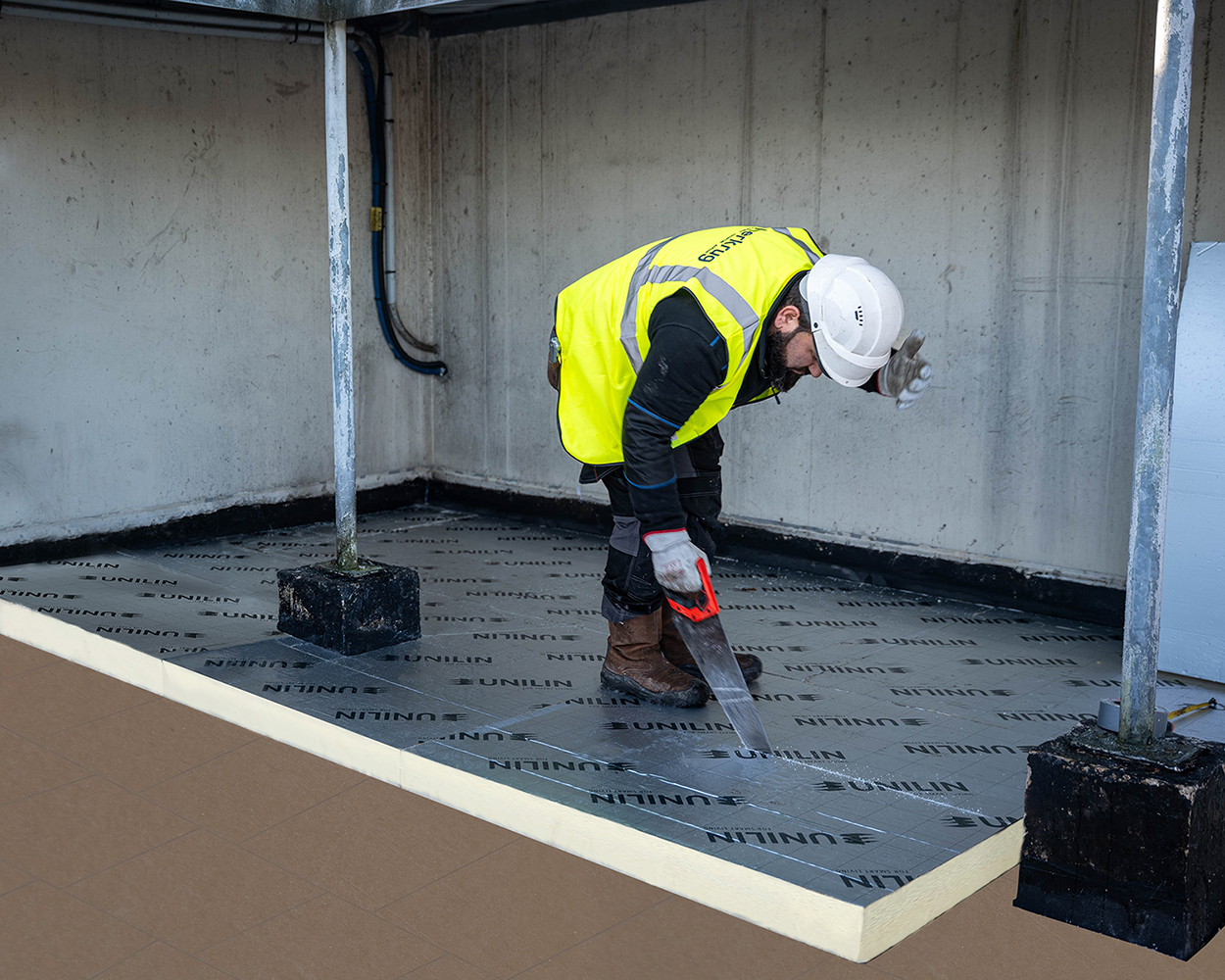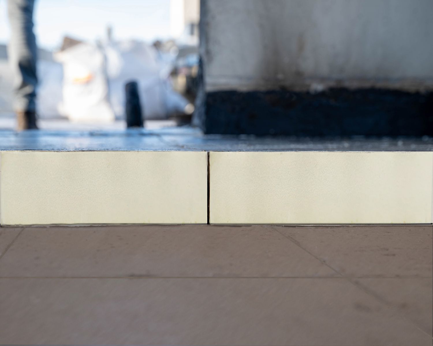 Plaque isolante Utherm Roof Tapered en polyuréthane pour l’étanchéité et l’isolation des toitures terrasses. © Unilin