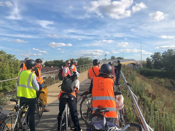 Pendant le parcours à vélo (Parcours Philléas Olympique) proposé en off des Rencontres et placé en clôture, l'ingénieur Antoine Baugé explique la passerelle de Dugny qui, malgré ses goujons collés et son BLC, se distingue sans doute comme l'un des ouvrages le plus "frugal" des installations pour les JOP 2024. © Jonas Tophoven