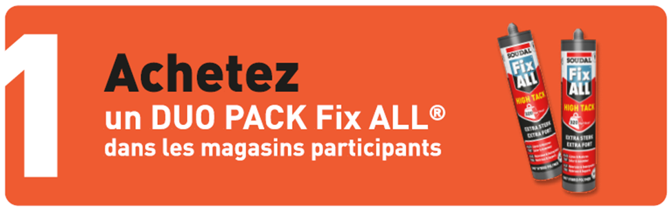 Avec le nouveau programme de fidélité Fix ALL® MAX, Soudal récompense les professionnels pour l'achat de Duo Packs Fix ALL® High Tack, Fix ALL® Crystal, Fix ALL® Turbo.
