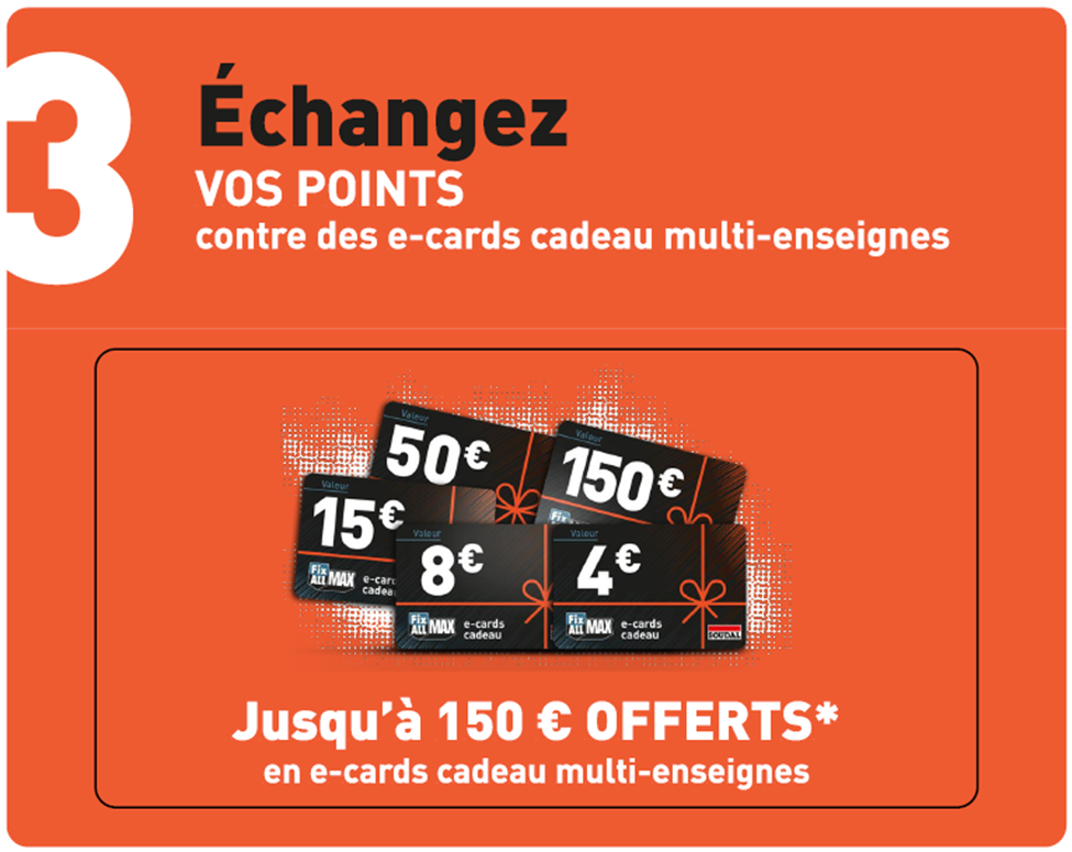 Avec Fix ALL MAX, chaque Duo Pack acheté vous fait gagner 20 points. En 6 mois de chantiers, cela représente jusqu'à 150€ de e-cards cadeaux. Pour faire exactement ce que vous faites déjà.