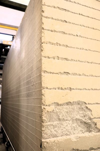 Il est découpé horizontalement, puis verticalement au fil d’acier (ici, des blocs Siporex de faible épaisseur). © EJH