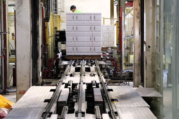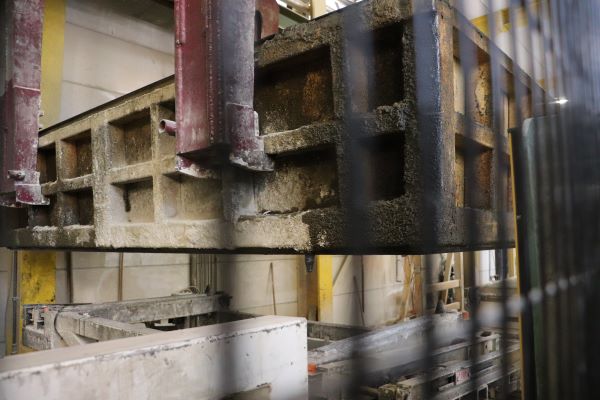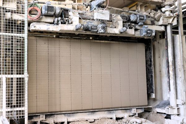 Les blocs doivent être dissociés par un écarteur (machine rouge) avant d’être enfournés dans l’un des six autoclaves. © EJH