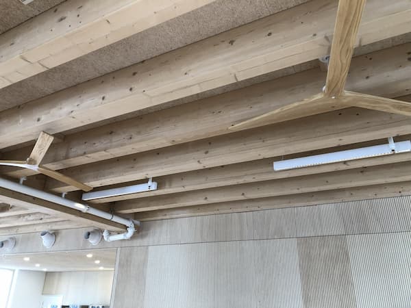 Cela a permis en principe de réduire les déflecteurs de la façade et de se passer du calcul C+D, de laisser le bois apparent à la fois en solives, mais pour des revêtements acoustiques muraux de AB Pano (Drouin) ou Organic (Knauf). Le groupement a tâché d’embellir le dispositif en recalant tous les équipements, notamment dans les classes et la cantine (luminaires, bouches de ventilation, sprinklers) sur la teinte 9006 (qui n’est malheureusement pas la même pour tous !). Les pales des brasseurs d’air systématiques sont par contre en bois.