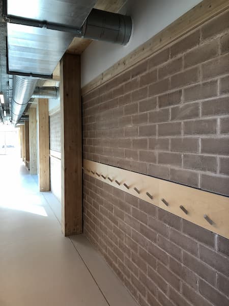 Quant au recul du bureau de contrôle, il s’agit sans doute des déflecteurs finalement imposés, ce qui se répercute sur le prix de construction mais presque pas sur l’élégance de la façade où Tectoniques développe encore plus qu’au Bourget son approche de plaquettes céramiques sur MOB. Au contraire, lorsque l’on sort de salles de classes si soignées avec leurs jolies pales, on se retrouve dans des circulations avec l’aéraulique visible, le flocage, les parois en brique de terre crue. Ce n’est pas grave et cela ressemble à l’esthétique frugale assumée de l'agence SAM aux Groues, mais le contraste avec les salles de classe est patent.