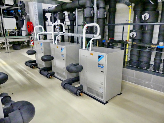 Six groupe VRV IV à condensation par eau assurent le préchauffage et le prérafraîchissement de deux CTA dans le bâtiment des laboratoires. © PP