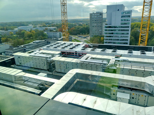 Pour atteindre de telles conditions dans les chambres de test, il faut des équipements de Génie Climatique tout à fait inhabituels et le toit du bâtiment des laboratoires en est couvert. Pour commencer, sous le bâtiment de bureaux sont percées 72 forages de 172 m de profondeur qui abritent chacun une boucle d’eau glycolée fermée, soit au total 42 km de canalisations pour l’échange de température avec le sous-sol. Ces boucles alimentent 19 groupes VRV IV (RWEQ) à condensation par eau de 60 kW de puissance unitaire.