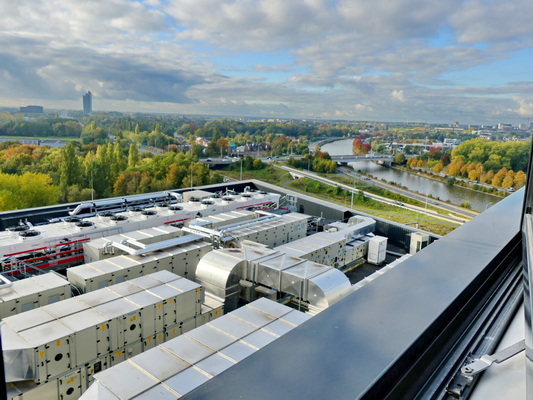 Au-dessus d’un étage de laboratoires et de chambres d’essai, un niveau technique est rempli de machines pour assurer le fonctionnement des chambres d’essai. Chaque chambre d’essai est alimentée par une CTA Daikin, laquelle est régulé par un ensemble de canalisations et d’échangeurs. Des ballons de stockage d’eau chaude et d’eau glacée lissent le fonctionnement des générateurs installées sur le toit. Outre les VRV IV à condensation par eau, les bureaux sont également traités par 13 VRV 5 à récupération de chaleur et de froid, utilisant le R32 : 9 pour la climatisation des bureaux des niveaux 0 à 6 et 4 pour le préchauffage et le prérafraîchissement des étages 7 à 13. Les unités intérieures sont 12 cassettes FXZQ/FXZA et 77 gainables FXZQ/FXZA, soit 14,5 km de canalisations chargées en R32. On compte également, pour bien faire, une pac Daikin Altherma eau/eau et deux pac Daikin Altherma air/eau. Le traitement d’air est assuré par 5 CTA Daikin, soit 297 kW de puissance froid et 85 000 m3/h de débit d’air. Quatre de ces CTA sont placées sur le toit du bâtiment de laboratoires et une sur le toit du bâtiment de bureaux. Trois CTA, raccordées à deux VRV à condensation par eau et à un VRV à condensation par air, alimentent les bureaux et deux, raccordées à des VRV à condensation par air, alimentent les laboratoires.