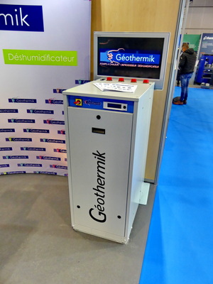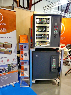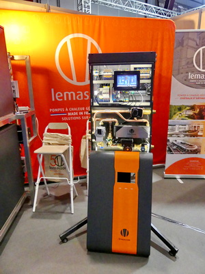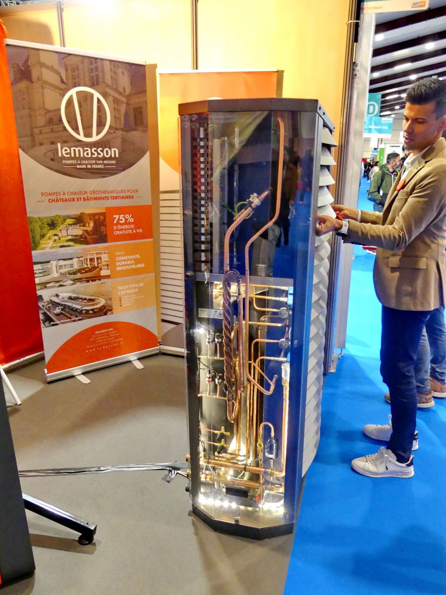 Notre premier arrêt était sur le stand de Lemasson. Depuis 1975, Lemasson conçoit et fabrique des pompes à chaleur géothermiques un peu spéciales. L’entreprise emploie 57 personnes et fabrique environ 500 pac géothermiques par an. Sur un marché français de 3 000 pièces par an, ça fait de lui un leader tout de même. Garanties 7 ans, ses pompes à chaleur sont dépourvues de carte électroniques et pilotées par des composants électromécaniques pour une meilleure fiabilités. Elles embarquent des échangeurs coaxiaux conçus et fabriqués par Lemasson. Du coup, l’évaporateur de leurs pompes à chaleur géothermiques supporte sans échangeur la plupart des eaux de captage. L’échangeur coaxial permet aussi une production d’ECS à 55 °C, voire plus à la demande, sans aucun appoint par résistance électrique, avec ne production instantanée sans ballon de stockage. La partie thermodynamique des pac est entièrement brasée. Le fluide est entièrement confiné.