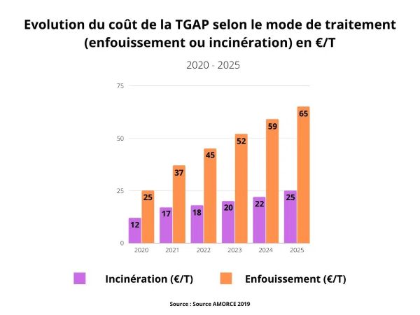Évolution du coût de la TGAP selon le mode de traitement. Source : AMORCE 2019