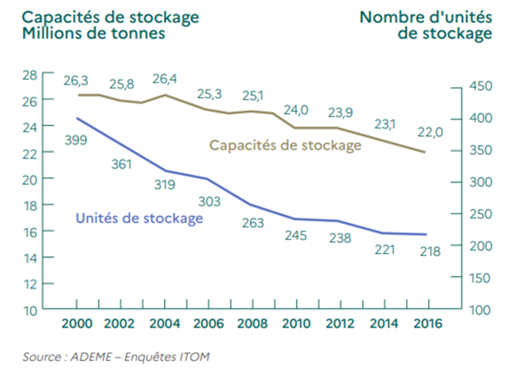 Légende : évolution du parc des Installations de stockage des déchets non dangereux et des capacités annuelles de stockage. Source : Ademe, déchets chiffres-clés, 2020