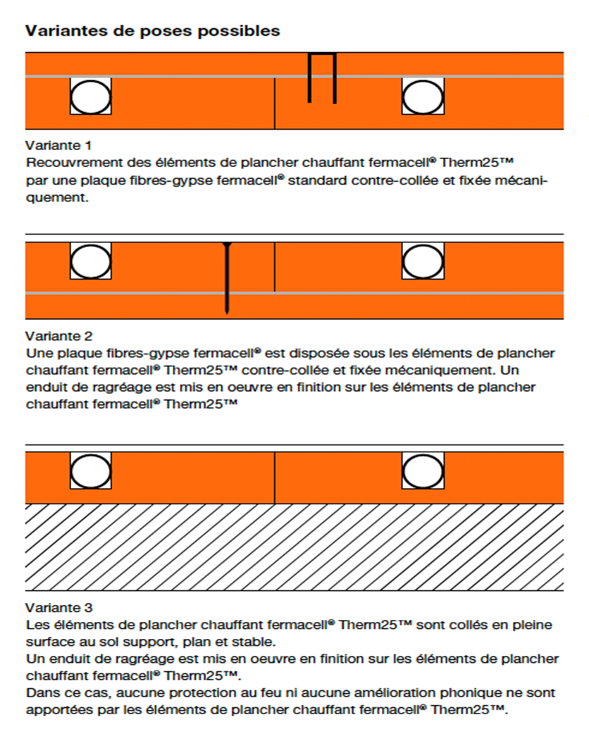 Épais de 25 mm, le procédé Therm 25 TM ne nécessite qu’une faible hauteur de réservation. Il se compose de plaques standard 1 X0,5 m rainurées pour la pose longitudinale des tubes en partie courante (environ 80 % de l’ensemble), et d’éléments à plots de 0,5 X 0,5 m positionnés dans les endroits singuliers comme les accès des tubes collecteurs et nourrices, les passages de portes, etc., qui représentent généralement 5 à 10 % de la surface (20 % au plus). Un calepinage précis est nécessaire pour assurer une distribution de chaleur homogène (un plan de calepinage est fourni par fermacell sur demande). Une ATex a été validée début octobre pour le Therm 25 TM, ce qui permet d’accéder en confiance à tous les types de projet.