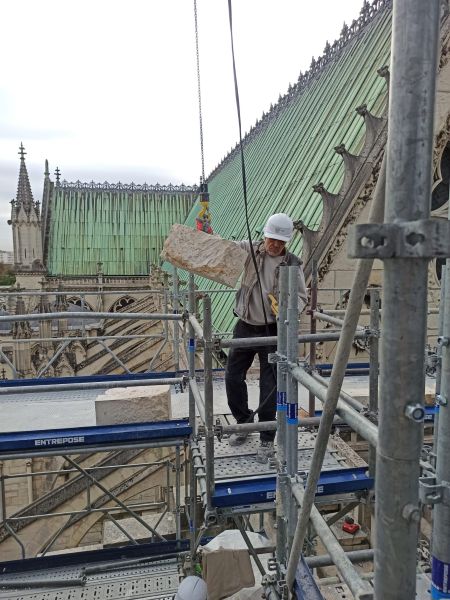 Pour la reconstruction de ce chef-d’œuvre architectural gothique du XIIe siècle, toute une panoplie de matériaux (pierre, métal, bois) est utilisée, avec une toutefois une prédilection pour la pierre. De fait, les premières pierres, minutieusement taillées par les artisans du groupement des entreprises SNBR SCOP (mandataire de l’opération), H. Chevalier et L'atelier des sculpteurs, sont déjà acheminées en hauteur des échafaudages installés sur la partie nord de la cathédrale. Et, il en faudra 15 228 ! 15 % d'entres elles seront taillées en direct sous les yeux des visiteurs par les tailleurs et tailleuses à la Fabrique de la flèche, le chantier immersif et lieu culturel autour de la reconstruction de la tour nord et de la flèche qui vient d'ouvrir ses portes au pied de la basilique cathédrale Saint-Denis.