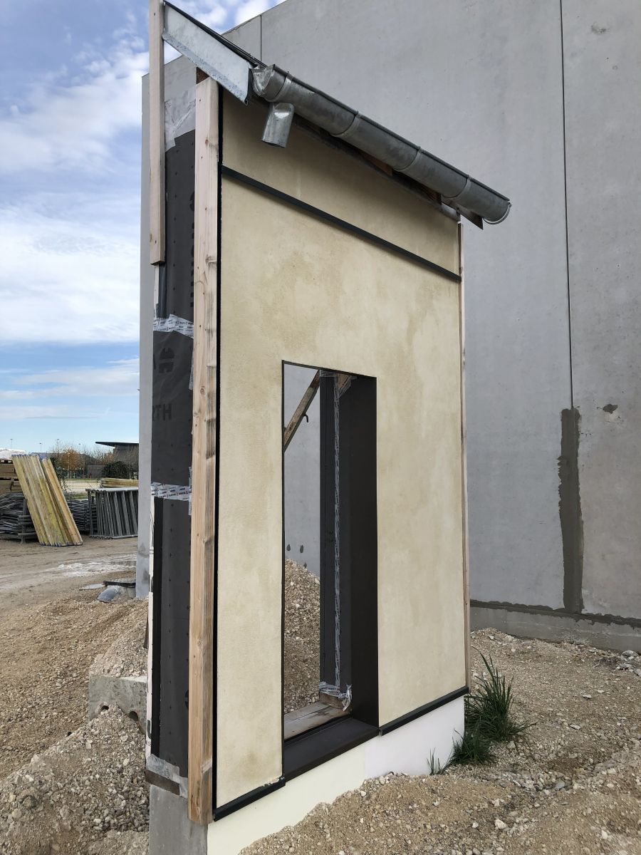 Parallèlement, l’ADEME finance un programme de recherche qui permet non seulement d’affiner l’option de l’enduit extérieur plâtre, mais aussi d’avancer vers un enduisage hors site (corps d’enduit). Au second congrès de la construction paille, à Paris en janvier 2025, Néo Solsona retrouve l’architecte Corentin Desmichelle et lui propose d’intégrer ce type de prescription pour un chantier paille futur. Corentin Desmichelle, qui suit la construction paille depuis toujours, propose une médiathèque en projet pour 2026, puis se ravise afin de gagner du temps, et valide le recours à l’enduit plâtre sur son projet avancé de médiathèque à Ingré.
