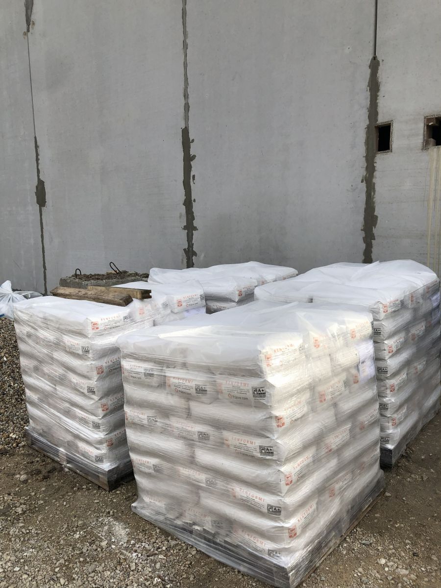 Sacs de Renformi de Plâtres Vieujot, su rle chantier. Ces sacs continennet un mélange, très peu de sable, un peu de chaux pour la malléabilité et pour ses vertus anti-fongiques. Potentiellement, la solution Renformi est économique pour le coût matière, et pour le temps de mise en oeuvre. © Jonas Tophoven