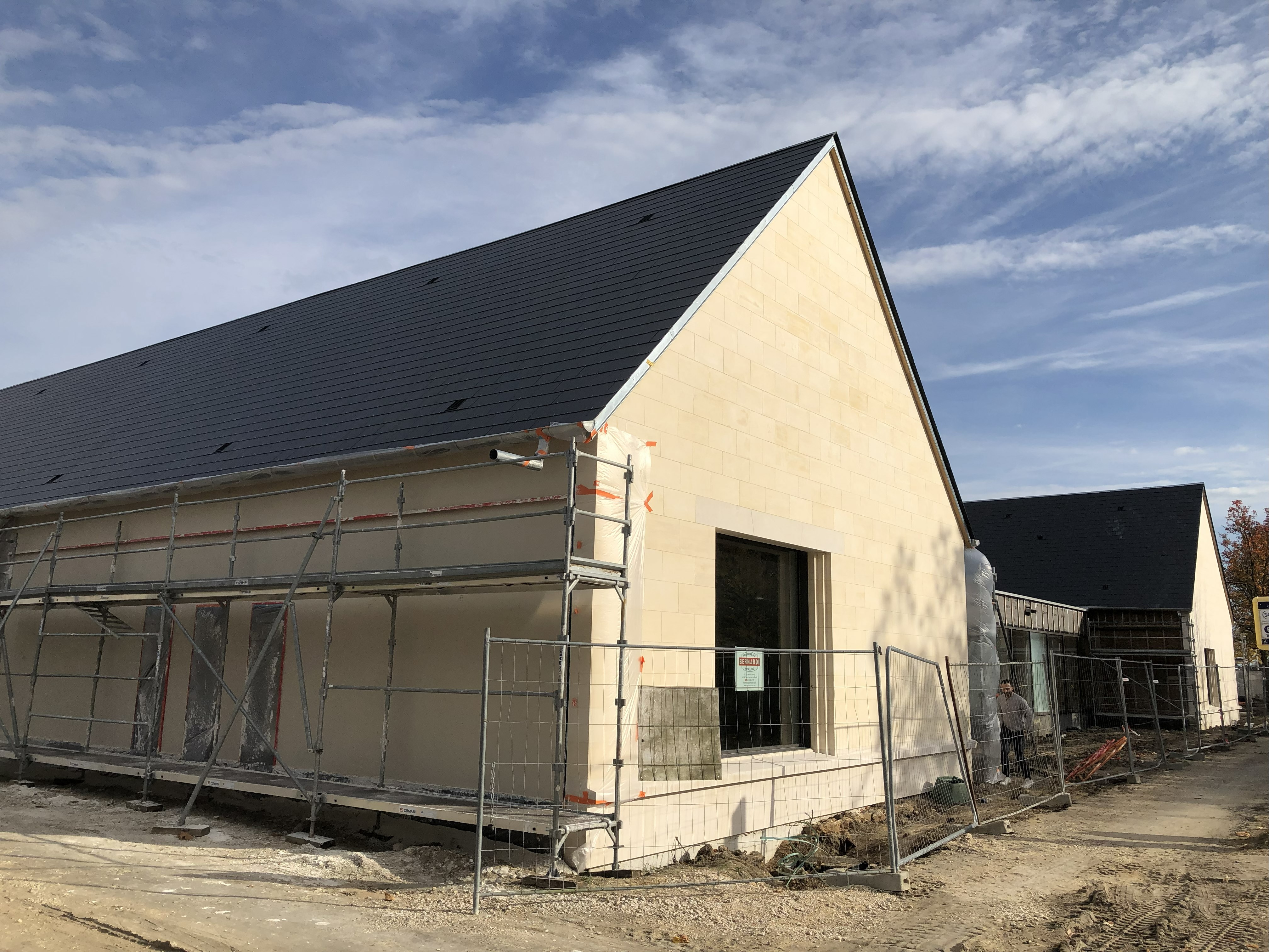 L’isolation extérieure est en paille, une habitude pour l’agence et une évidence à deux pas de la Beauce. Côté vernaculaire, l’un des atouts du projet est sa façade en pierre claire de Tercé, finalement trop onéreuse pour habiller tout le bâtiment. La clarté du corps d’enduit prolonge bien la pierre, mais l’enduit de finition sera volontairement plus foncé, marquant le travail manuel par son irrégularité affichée.