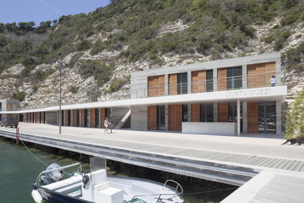 Lauréat 2017 : Buzzo Spinelli Architectes - Maison des pêcheurs à Bonifacio. La maison des pêcheurs de Bonifacio, adossée à la falaise calcaire dont elle semblerait s’être détachée, offre un véritable lieu de vie aux pêcheurs. © Serge Demailly