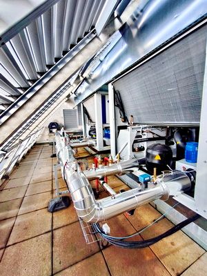 Les concepteurs ont pris en compte le Règlement Européen F-Gaz et son calendrier de sévérisation. Ils ont compris que des DRV (Débit de Réfrigérant Variable) utilisant le R410A ou le R32 deviendraient de plus en plus coûteux à maintenir. Ils ont donc opté pour deux pompes à chaleur réversible air/eau Carrier Aquasnap 30RQP et une distribution à quatre tubes d’eau chaude pour le chauffage et d’eau glacée pour le rafraîchissement vers des ventiloconvecteurs. Le réseau en quatre tubes signifie qu’il est possible de chauffer un local, tout en en rafraîchissant un autre : souplesse de fonctionnement.