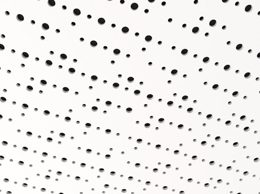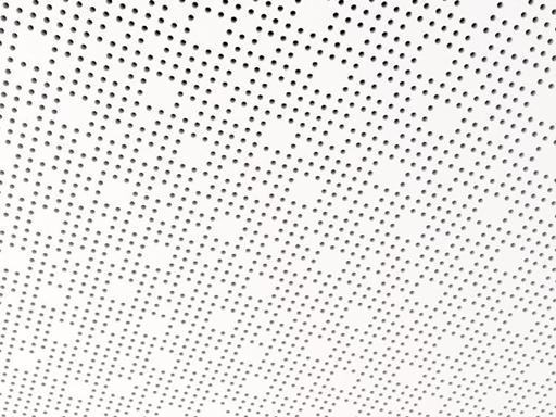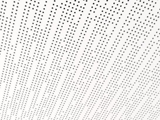 Rondes et régulières, les perforations du motif Astra évoquent une pluie d’étoiles en mouvement. À la fois structuré et aléatoire, ce motif offre un jeu de perspectives avec une linéarité dans un sens et une dispersion graduelle dans l’autre. La plaque Rigitone® Edge Astra possède un taux de perforation de 12 % permettant d’atteindre une absorption acoustique (αw) de 0,65 sans laine de verre et de 0,70 avec une laine de verre de 60 mm (plénum de 200 mm).