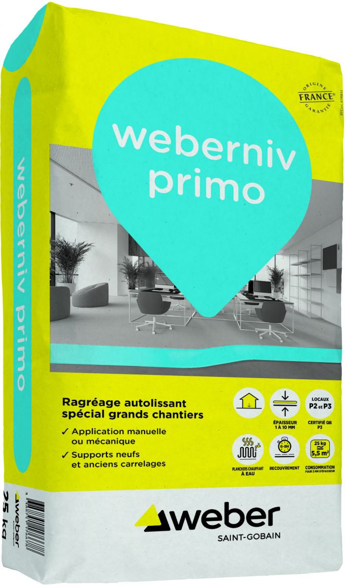 weberniv primo constitue la solution P3 dédiée aux grands chantiers intérieurs. Autolissant et fort d’une finition soignée, il traite efficacement les surfaces importantes (supports neufs et anciens) tout en offrant un recouvrement dès 6 à 8 heures selon le revêtement. Il s’adresse particulièrement aux entreprises souhaitant allier rendement et qualité de surface dans des épaisseurs comprises entre 1 et 10 millimètres.