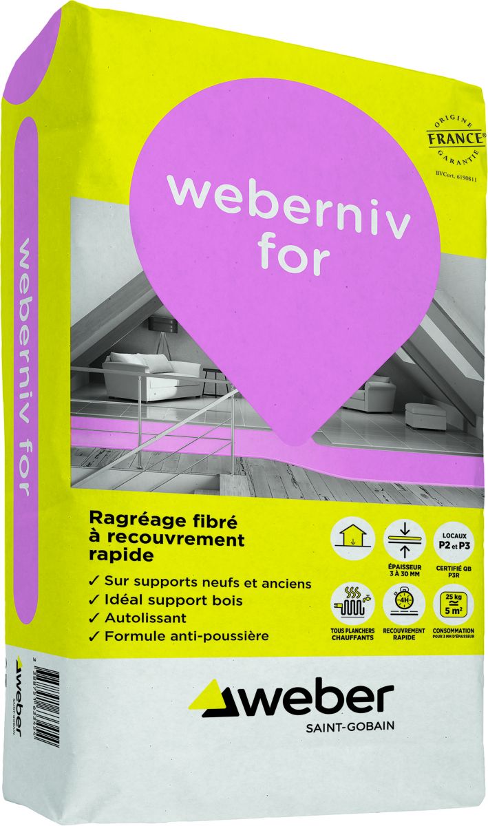weberniv for, aussi classé P3, fibré et anti- poussière, répond aux problématiques de rénovation intérieure. Sa compatibilité avec les supports sensibles, notamment les panneaux bois, le parquet et les anciens carrelages, en fait une référence pour les chantiers mixtes. Son recouvrement rapide, entre 3 et 4 heures selon les conditions, permet d’optimiser l’enchaînement des corps d’état.