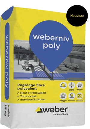 Nouveauté de la gamme, weberniv poly s’impose comme un ragréage polyvalent P4S, utilisable en intérieur comme en extérieur. Conçu pour résister à un trafic intense, il accepte une grande diversité de supports et est compatible avec les planchers chauffants hydrauliques. Il se positionne comme la solution idéale pour les locaux sollicités et les rénovations exigeantes.