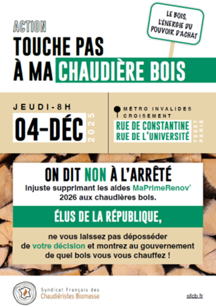 L'affiche du Syndicat français des chaudiéristes biomasse appelant à la manifestation. "On réclame une égalité de traitement dans les subventions", a martelé auprès de l'AFP Hervé Le Horgne, porte-parole du Syndicat français des chaudiéristes biomasse (SFCB), organisateur de la manifestation. © SFCB