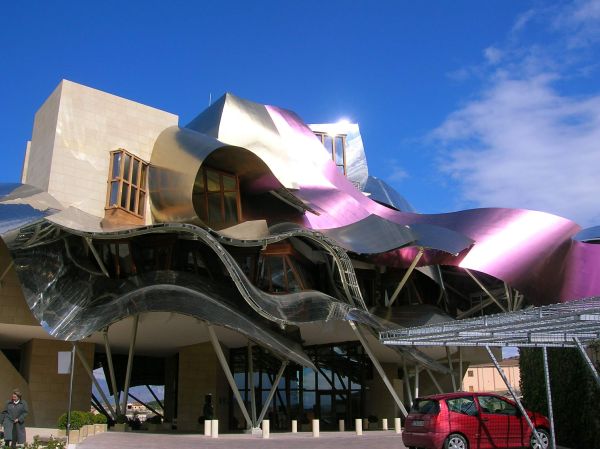 Planté au milieu des vignes dans la région de la Rioja au Pays basque (Espagne), cet hôtel à la structure futuriste se développe tout en vagues, dans un entrelacs de rubans de métal aux nuances colorées scintillantes au soleil. Associant la pierre, le verre et le titane, l'ensemble du bâtiment a été dessiné par Frank Gehry ainsi qu'une partie du mobilier des 43 suites.