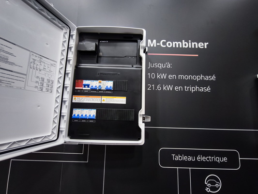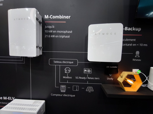 ATMOCE déroule son offre globale sur son stand : micro-onduleurs de 600 à 1200 W, avec des rendements de 98,2 %, son armoire M-Combiner qui est le point central du système PV domestique, sa batterie M-ELV de 7 kWh avec une capacité de décharge de 5 kW, son module M-Backup qui bascule en moins de 10 micro-secondes et sa M-Gateway pour une gestion énergétique efficace. Tout ça peut se monter sur des installations neuves ou sur des installations PV existantes. © PP