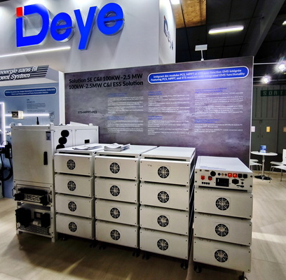 Les solutions de stockage tertiaires sont toujours à base de batteries LFP et modulaires. DEYE met en avant ses modules SE CSI de 100 kW (215 kWh) ou 125 kW (241 kWh) de puissance, couplables pour atteindre 2,5MW avec 16 modules, soit 3856 kWh. © PP
