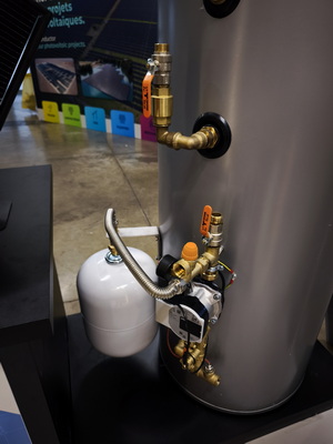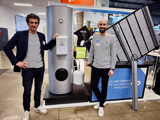 Jérôme Mouterde à gauche, co-fondateur de DualSun, et Etienne Fouillous, ingénieur support technique, présentent la nouvelle solution Springbox et le ballon DUO de DualSun à EnerGaïa : maximiser l’autoconsommatio, assurer le confort eau chaude et minimiser l’appel au réseau électrique. © PP