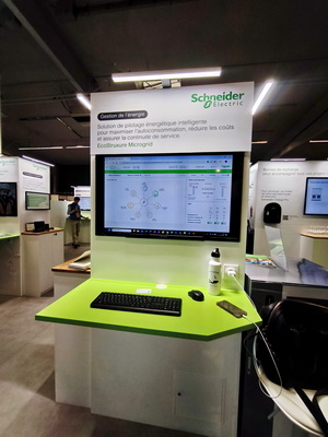 À EnerGaïa 2025, Schneider Electric exposait peu de matériel, seulement ses bornes de chargement de véhicules électriques et une caisse en carton figurant sa nouvelle offre de stockage d’électricité, mais plutôt les dernières évolutions de ses logiciels de supervision, notamment pour la gestion et le pilotage des microgrids. Selon l’industriel, un microgrid est un ensemble de ressources électriques distribuées, comprenant des charges flexibles (le chargement de véhicules électriques, par exemple), toutes sortes de productions comme du photovoltaïque et/ou de l’éolien, ainsi que du stockage d’électricité, tout ça en parallèle du réseau de distribution publique ou bien connecté au réseau. Si le microgrid est connecté au réseau, l’objectif doit être de maximiser l’autoconsommation, de gérer le back-up, … Pour ça Schneider Electric présentait un EMS (Energy Management System) spécifique, baptisé EcoStruxure Microgrid, réactif sur site et capable de piloter le système.