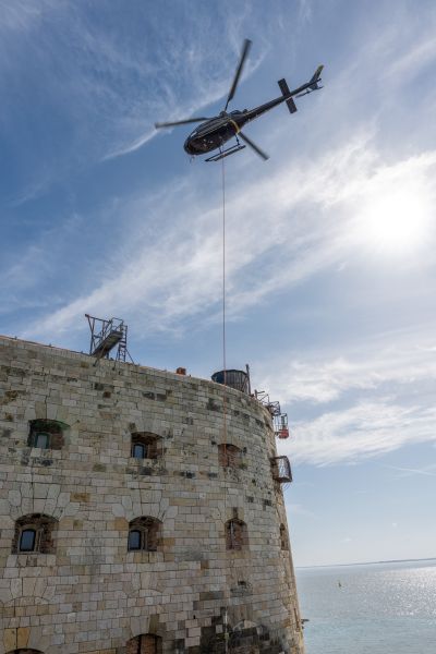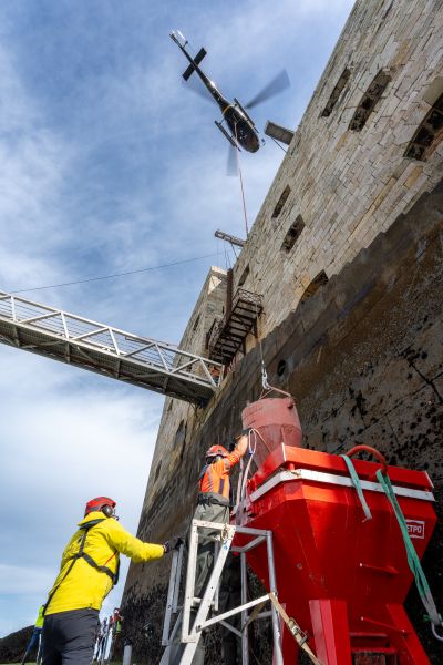 Deux premières phases de ce chantier hors norme, concernant la risberme, viennent de s’achever. Tout d'abord, en septembre, 20 m3 de béton (soit trois toupies), spécialement formulés par Edycem pour répondre aux conditions extrêmes du fort, ont été acheminés par hélicoptère.