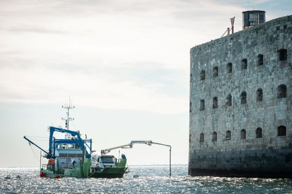 Ensuite, en octobre, un camion mixo-pompe Edycem de la centrale de Rochefort est monté à bord d’une barge du département de Charente-Maritime pour une opération de coulage en pleine mer.