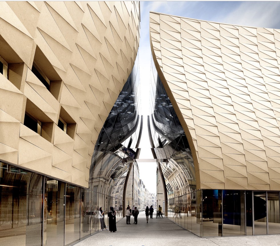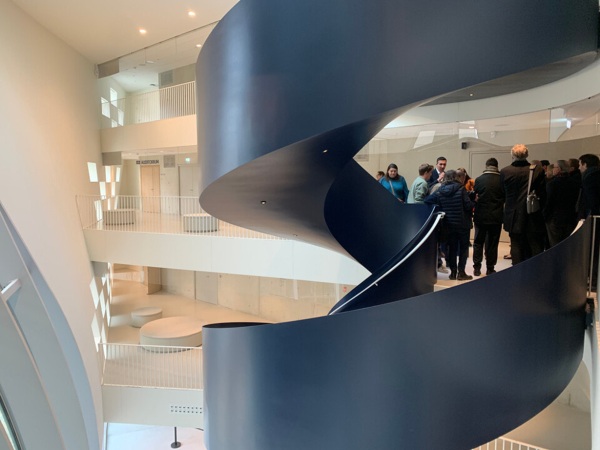 Au cœur du projet, deux atriums généreux se font face de part et d’autre de la rue piétonne. Cet espace, appelé le "Kiss" par les architectes, correspond au point d’effleurement où les façades vitrées des deux bâtiments se courbent l’une vers l’autre au-dessus de la rue Jean-Reboul. Cette idée, d’un baiser architectural, imaginée par les cabinets Chabanne et 3XN, est renforcée par une passerelle en verre dessinant un "h" minuscule. D'où le nom du site. © Ville de Nîmes