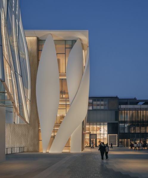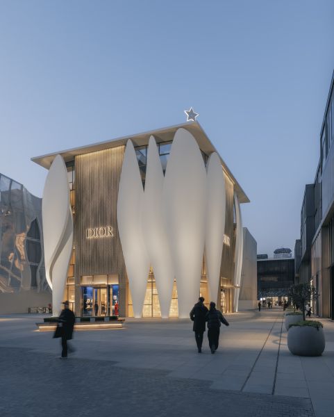L’architecture des flagships Dior est pensée par Christian de Portzamparc comme une collection, dans la continuité de l’architecture sculpturale qu’il a réalisée pour les flagships à Séoul en 2015 et Genève en 2024. À Pékin, il imagine un écrin porté par quatorze coques blanches en forme de feuilles incurvées, souvent enroulées en spirales. La nuit, la boutique s’illumine de l’intérieur, révélant la silhouette majestueuse des pétales. © Zhu Yumeng