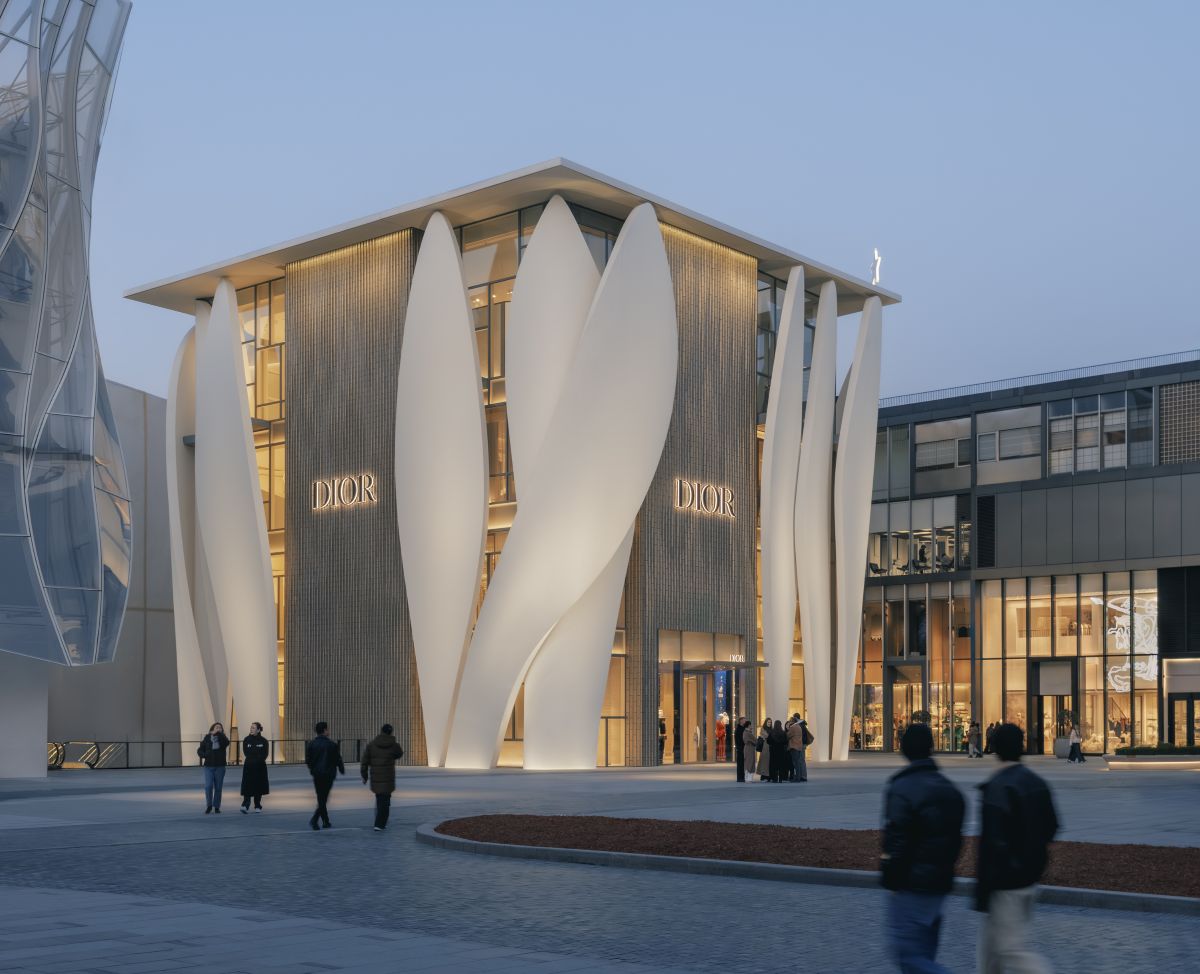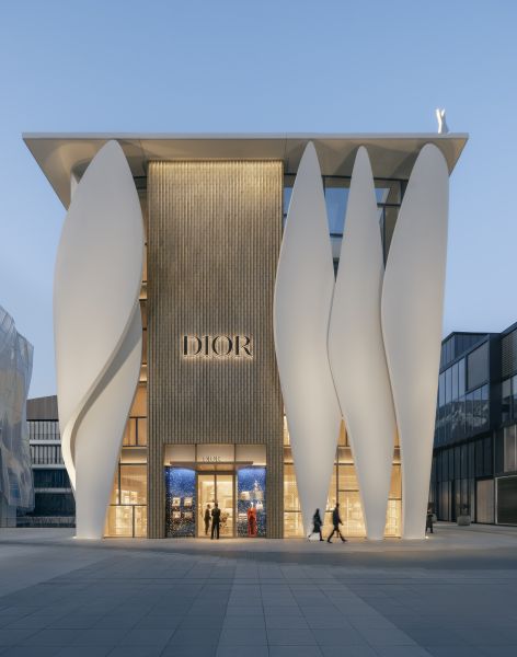 Ce nouvel écrin est l'une des plus grandes boutiques de la Maison Dior. Pensé dans l'esprit de collection des flagships Dior conçus par Christian de Portzamparc, le bâtiment se distingue par une architecture sculpturale composée de quatorze coques blanches en forme de feuilles incurvées. Ces pétales évoquent les drapés des toiles que Christian Dior modelait pour créer ses robes. Ils soutiennent un grand plan de toiture unifiant l'ensemble du bâtiment.