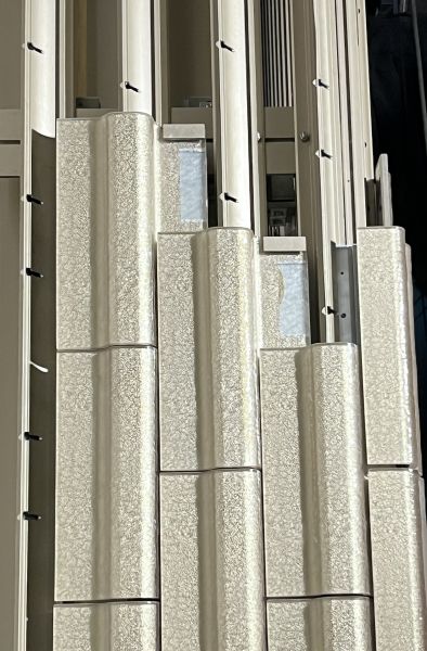 Les tuiles, dont la forme varie légèrement, créent une vibration de la surface et participent au traitement de la lumière sur l’enveloppe du bâtiment. L’assemblage spécifique des différents éléments génère un jeu d’ombres et de transparences évoluant selon les conditions d’éclairage.