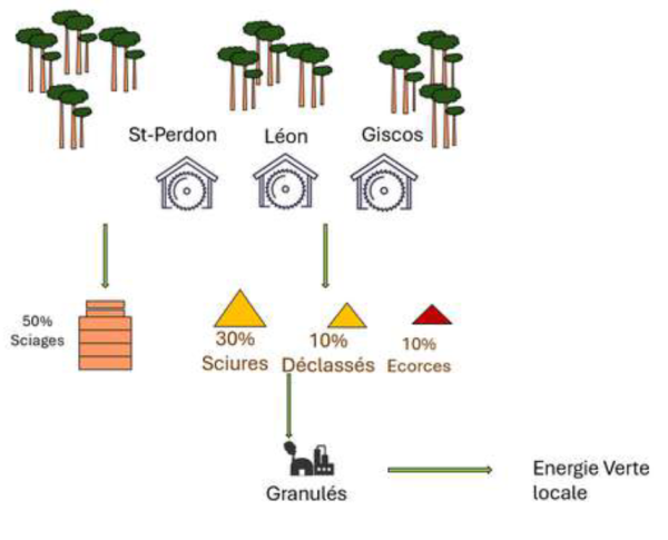 Produits exclusivement à partir des coproduits issus du sciage du pin maritime (sciures, bois déclassés et sur-longueurs) les granulés Pellets Solutions + incarnent pleinement la démarche circulaire du groupe. Aucun arbre n’est coupé spécifiquement pour leur fabrication : la matière provient uniquement de la transformation du bois réalisée dans les scieries Lesbats.