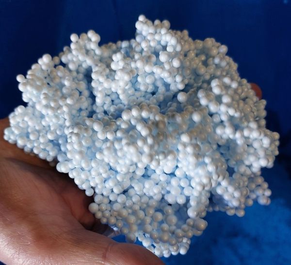 Issues de la découpe de blocs et de panneaux, les billes de polystyrène expansé (PSE) sont récupérées, puis soigneusement triées avant d'être broyées et regranulées selon un procédé spécifique, leur permettant de retrouver leur structure d’origine et leurs propriétés initiales. © Laure Pophillat