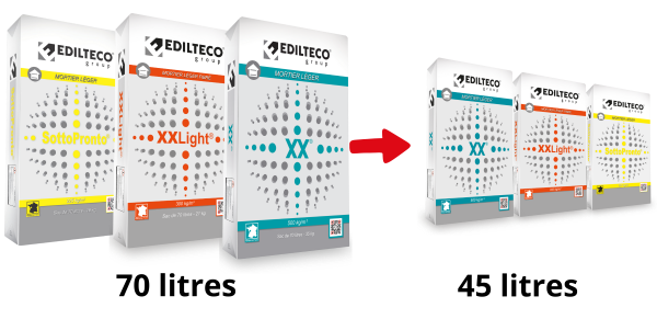 Edilteco a complété ses innovations techniques par des améliorations pratiques et logistiques. Ainsi, au sein de la gamme de mortiers et chapes légères Prêt à l’Emploi, les mortiers légers XX®, XXLight®, SottoPronto® et PLUS®, ont vu la taille de leur conditionnement évoluer : les sacs passent désormais de 70 litres à 45 litres. Un changement qui optimise l’espace de stockage, limite les pertes et le gaspillage, et réduit la pénibilité au quotidien pour les équipes. © Edilteco