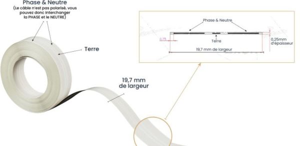 Le câble électrique ultra-plat 230V/16A se fixe directement sur les surfaces, sans perçage ni saignée et sans gaine plastique. Il peut ensuite être rendu invisible facilement et rapidement, sans aucun travaux. Le dispositif se compose d’un câble breveté et d’une connectique intuitive permettant de relier facilement n’importe quel appareil (luminaire, télévision, système domotique) à une prise existante.