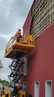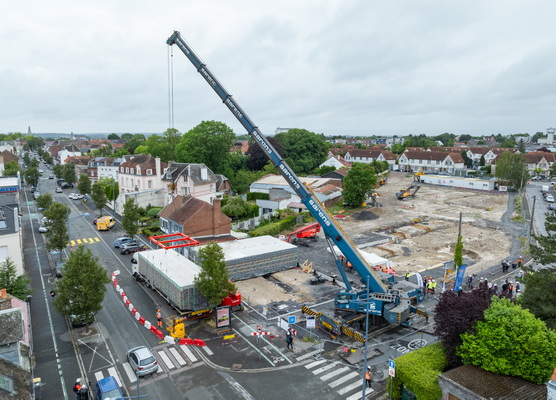 Il faut un peu moins d’une heure entre l’arrivée d’un module et sa pose. Une grue de levage facilite l’exercice. ©TH