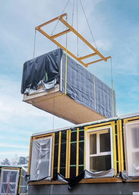 Une fois les modules assemblés, il faut encore installer la couverture, le pare-pluie, le bardage des façades et les escaliers extérieurs, puis procéder aux branchements des réseaux : électricité, eau froide, eau chaude et eaux usées et ventilation. ©TH