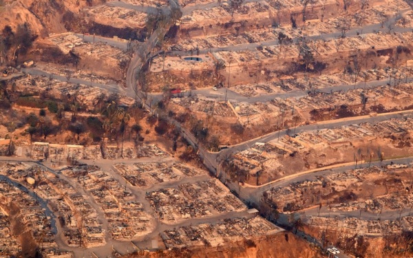 Fonroche Lighting, installée à Agen et présente aux États-Unis depuis 2019, s’est déjà fait remarquer par son savoir-faire, en intervenant en urgence pour sécuriser des quartiers entiers de Los Angeles lors des terribles incendies survenus il y a un an. Le feu, le plus important de tous ceux qui ont fait rage dans la région de Los Angeles, avait dévoré quelque 9 500 hectares de Pacific Palisades (ici en photo). En moins de 24 heures, Fonroche Lighting avait installé plus de 1 000 lampadaires sur Pacific Palissade et Sunset Boulevard. © Josh Edelson / AFP