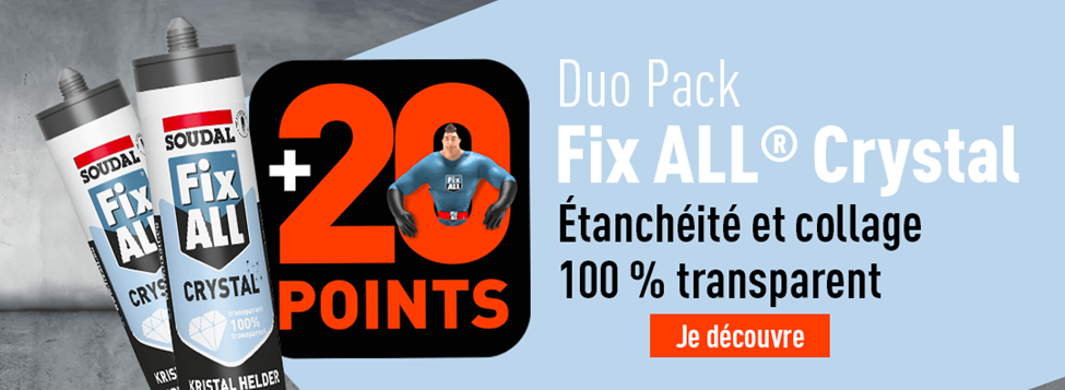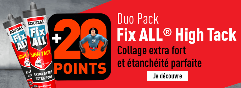 Le programme de fidélité Fix ALL® MAX de Soudal vous met au défi ! Saurez-vous réussir les Défis Max et remporter encore plus de cadeaux ? Le principe reste le même : 1/ acheter des Duo Packs de mastics et colles Fix ALL®, 2/ cumuler des points – et même plus de points grâce aux Défis Max, 3/ les échanger contre des e-cards cadeau jusqu’à 150 €. Avec le programme de fidélité Fix ALL® MAX, Soudal récompense les pros à chaque achat de : Fix ALL® High Tack, Fix ALL® Crystal et Fix ALL® Turbo.