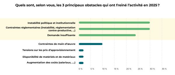Les principaux freins identifiés sont l’instabilité politique et institutionnelle et les contraintes réglementaires (60 % des réponses). © AIMCC