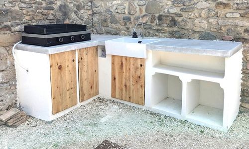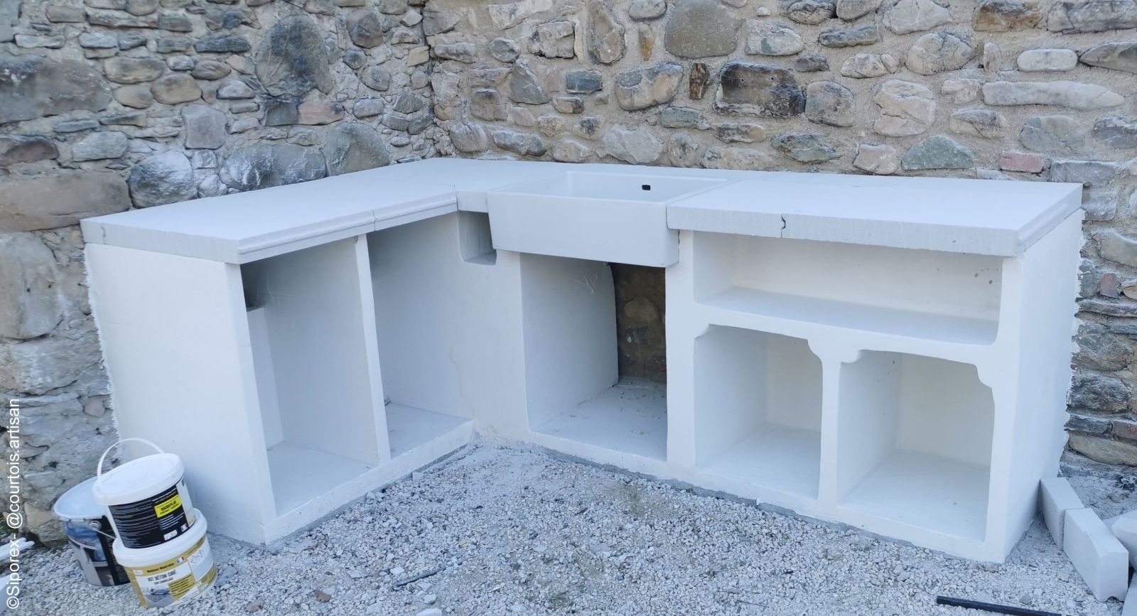Ce meuble en L a été conçu en carreaux de béton cellulaire, un matériau à la fois solide et léger, modulable et hydrofuge. Pour profiter durablement de sa cuisine d’été et rendre imperméables les carreaux SIPOREX, il les a enduit de 2 couches de primaire, puis de 2 couches de béton ciré pour parfaire l’esthétique, blanc pour la structure et gris pour le plan de travail, et enfin une couche de vernis protecteur extérieur. Pour offrir un cachet incomparable, @courtois.artisan a réalisé des moulures dans les angles de certaines niches.