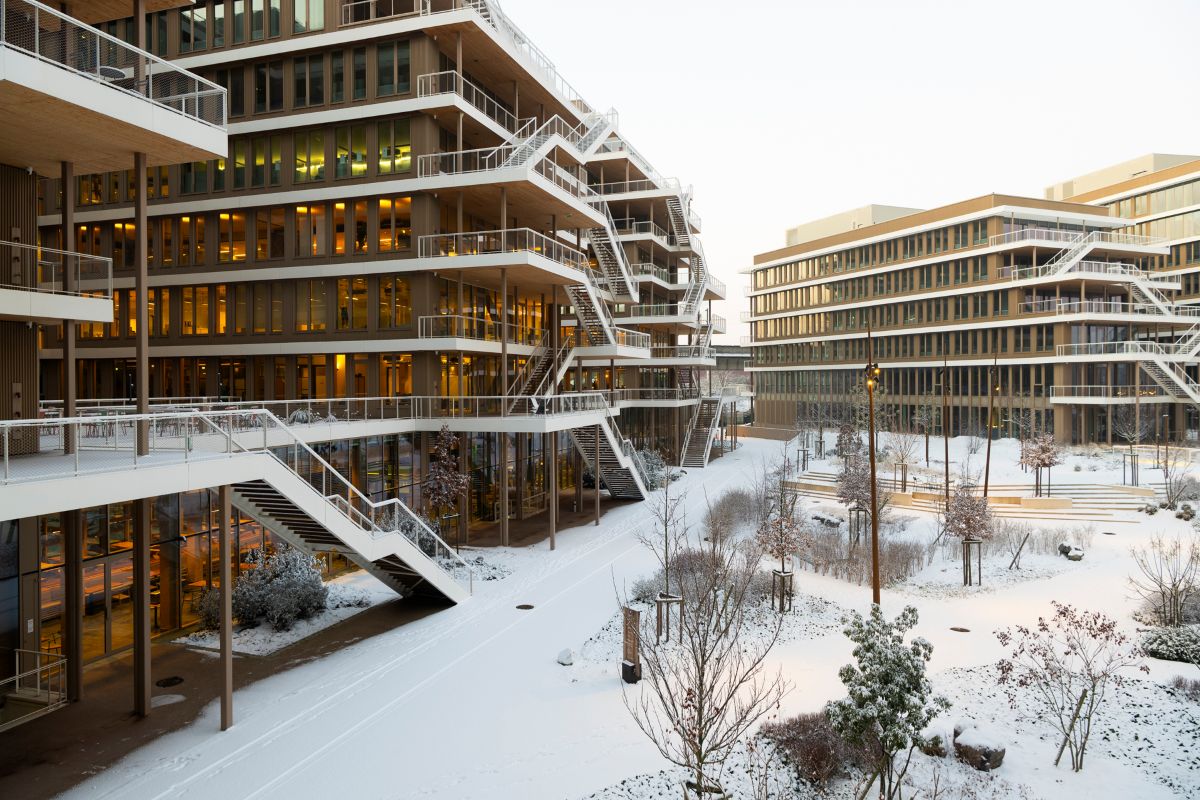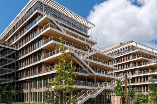 Développé sur une surface totale de 126 000 m2, le Campus Arboretum s’affirme comme le plus important ensemble de bureaux en structure bois jamais réalisé en Europe et constitue, à ce titre, une opération de référence en matière de conception bas-carbone à l’échelle tertiaire. Le projet repose sur la mise en œuvre de 32 400 m3 de bois et sur un dispositif énergétique combinant dix puits de géothermie, dimensionnés pour assurer à eux seuls 80 % des besoins en chauffage et en rafraîchissement du site, y compris les consommations des espaces privatifs. Cette approche globale, intégrant l’analyse du cycle de vie dès la conception, permet de réduire de moitié l’empreinte carbone du campus, tout en divisant par 3,5 les consommations énergétiques des futurs occupants, des performances environnementales d’ampleur désormais reconnues par l’obtention du label BBCA Excellence. © Nicolas Thouvenin